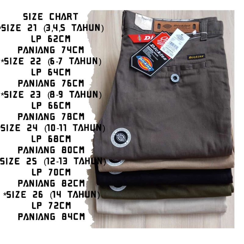 ● SIZE CHART *SIZE 21 (3,4,5 TAHUN) LP 62CM PANJANG 74CM *SIZE 22 (6-7 TAHUN) LP 64CM PANJANG 76CM *SIZE 23 (8-9 TAHUN) LP 66CM PANJANG 78CM *SIZE 24 (10-11 TAHUN) LP 68CM PANJANG 80CM *SIZE 25 (12-13 TAHUN) LP 70CM PANJANG 82CM *SIZE 26 (14 TAHUN) LP 72CM PANJANG 84CM ● Bahan Premium Grade A, Jahitan Rapih, Kancing Berlogo, Pinggang Sablon Dickies ● Saku Depan Kanan Kiri , Saku Belakang Kanan Kiri (Sebelah Kanan Berkancing Dickies) ● Celana ini terbuat dari bahan Cotton Combed Diamond. Terbukti halus, tebal, dan tidak luntur ● Celana ini jenisnya Slim Fit. Jadi cocok banget dipakai oleh berbagai usia dari anak 9th keatas sampai remaja-dewasa loh ● Dikerjakan dengan mesin modern & tenaga kerja handal. Jahitan pasti kuat, rapi, dan presisi ● Kainnya melar (strech) ya. Jadi bisa buat kamu lebih fleksibel dan nyaman dalam beraktivitas sehari-hari ● Desain yang digunakan simpel dan trendy, membuat kamu terlihat keren dan stylish saat memakainya
