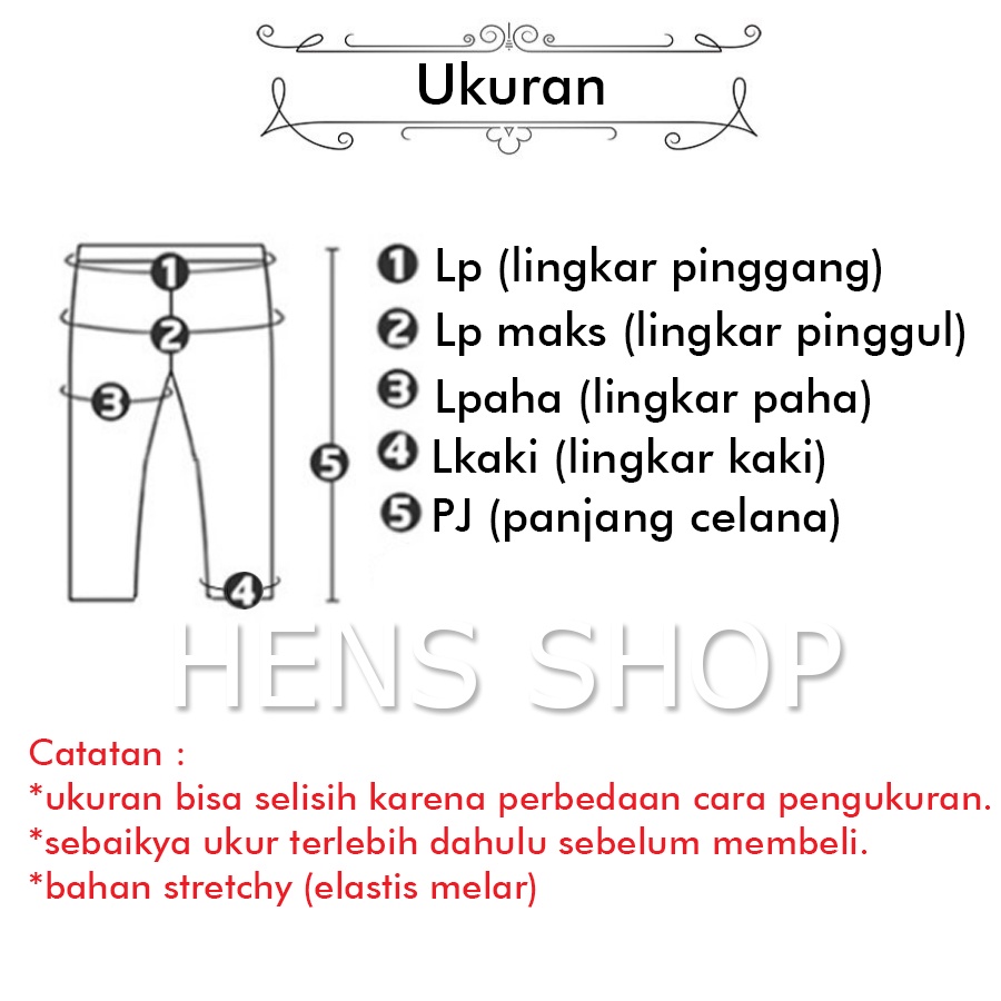 Ukuran All size Fit S-XL (BB 50-70kg) Hanya Kira2 Silahkan Diukur Ulang Agar Pasti STANDART Lp 65-100cm (pinggang karet) ada kancing dan resleting Lingkar Paha 60 melar 70cm an bahan elastis banget nyaman Pisak 32cm (model high waist tinggi menutup pusar) Lingkar kaki bawah 20cm - melar 30cm (bahan melar) Panjang +-98cm