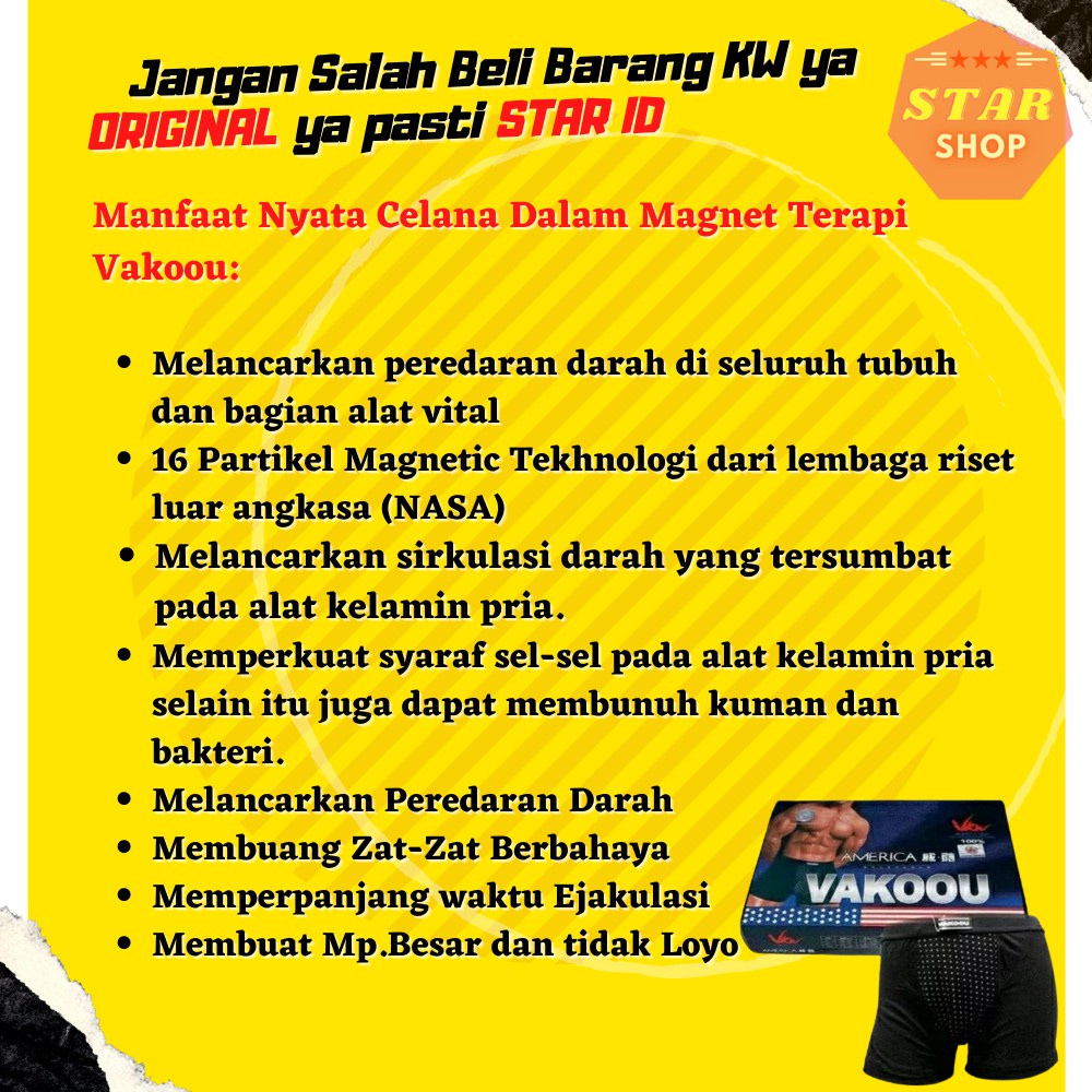 Manfaat Nyata Celana Dalam Vakoou: * Melancarkan peredaran darah di seluruh tubuh dan bagian alat vital * 13 Partikel Magnetic Tekhnologi dari lembaga riset luar angkasa (NASA) * Melancarkan sirkulasi darah yang tersumbat pada alat kelamin pria. * Memperkuat syaraf sel-sel pada alat kelamin pria selain itu juga dapat membunuh kuman dan bakteri.