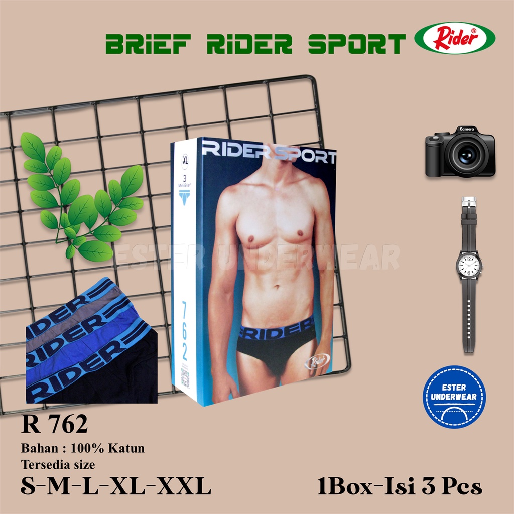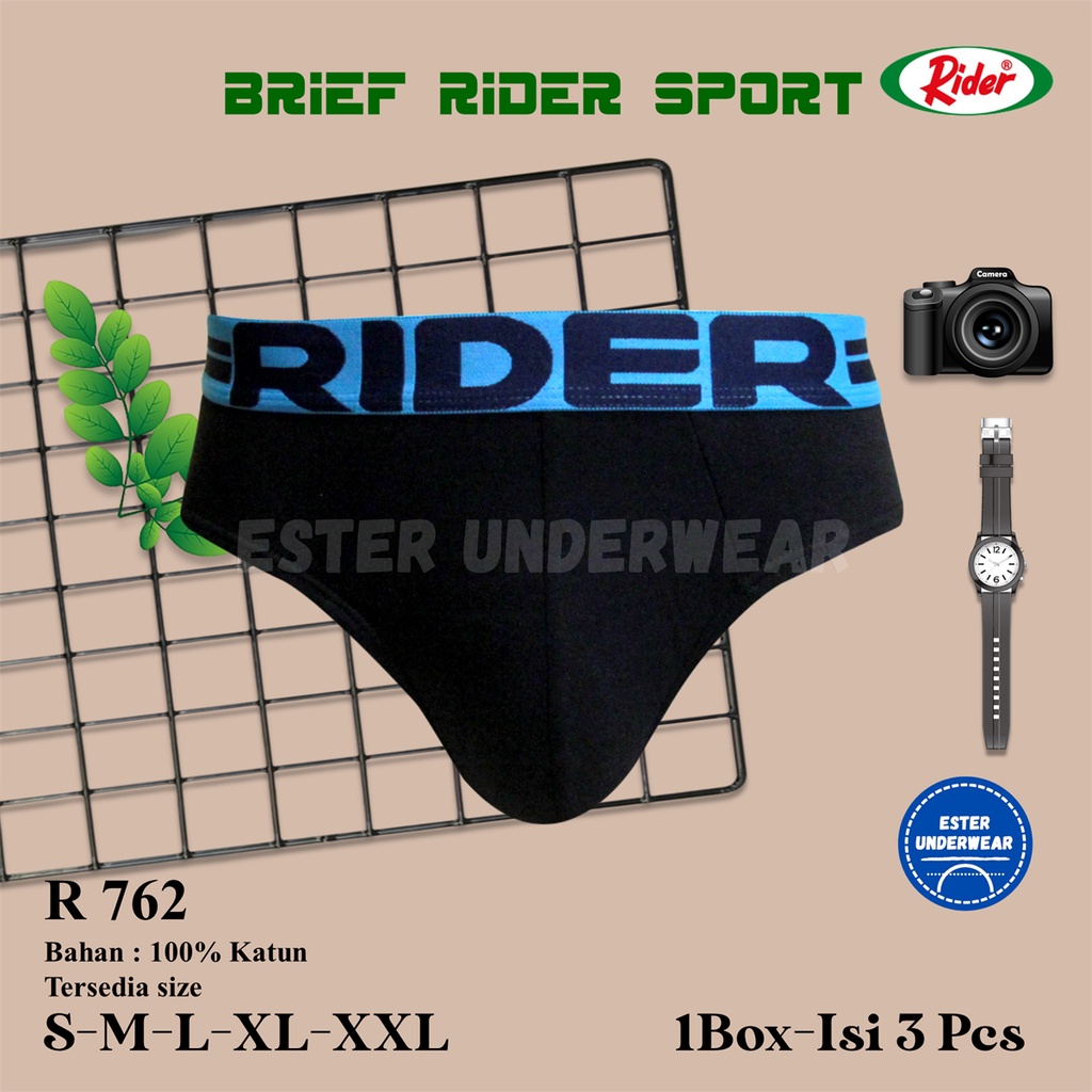 -Merek Barang : RIDER -Kode Barang : R 762 (3in1) -Jenis Barang : Celana Dalam -Warna : Mix Pabrik (Tidak bisa request Warna) -Berat Barang [Pcs/Pack] : 250 Gram -Bahan : Katun 100% -1 Pack isi 3 Potong -Size : S-M-L-XL-XXL -MADE IN INDONESIA