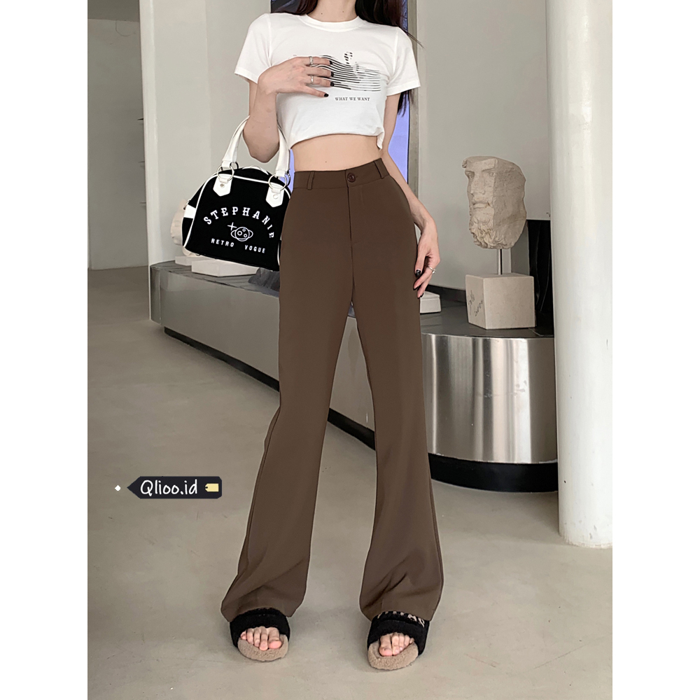 Detail Celana Flare Stretch Wanita Retro Highwaist pants Brown Korean Style