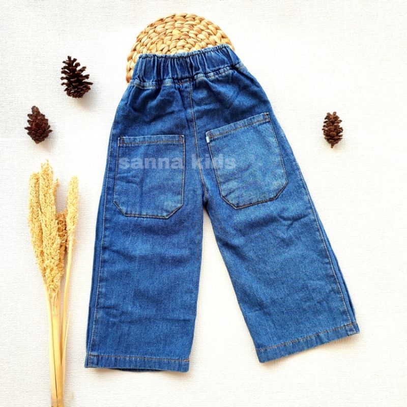 Celana Jeans Kulot Anak Material Jeans Soft 8 Ons Tebal Variasi kancing dari pinggang sampai bawah dan bordir motif Dilengkapi dengan tempat sabuk dan juga pengikat pinggang yang bisa di buat seperti tali pita