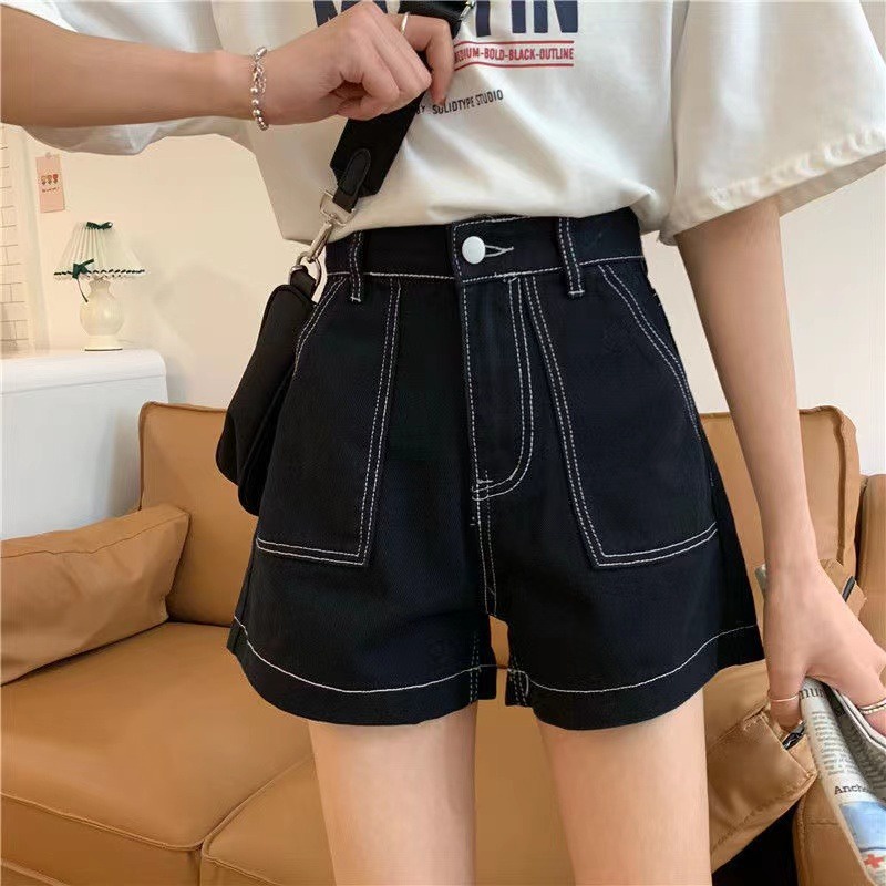 Nama: Celana Jeans Pendek Pinggang Tinggi Denim Celana Pendek Wanita Desain Niche Pelangsing A-Line Lebar Kaki Celana