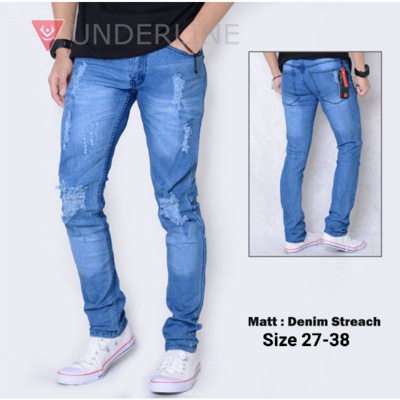 Celana Jeans Slimfit/sempit pada bagian mata kaki adalah celana jeans yg lagi trendy karena menggunakan bahan stretch/bahan melar dengan model DESTROY atau sobek-sobek.