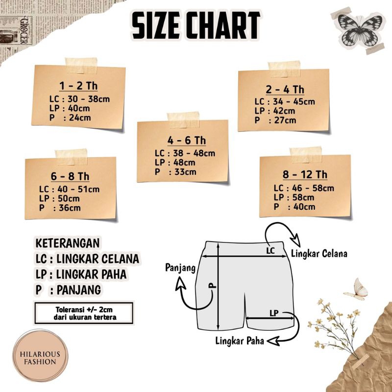 ●1-3 TAHUN PANJANG 31 LINGKAR PINGGANG 35 MELAR 72 CM ○3-5 TAHUN PANJANG 35 LINGKAR PINGGANG 40 MELAR 80 CM ♧5-8 TAHUN PANJANG 38 LINGKAR PINGGANG 60 MELAR 80 SAKU SAMPING ◇8-13TAHUN remaja