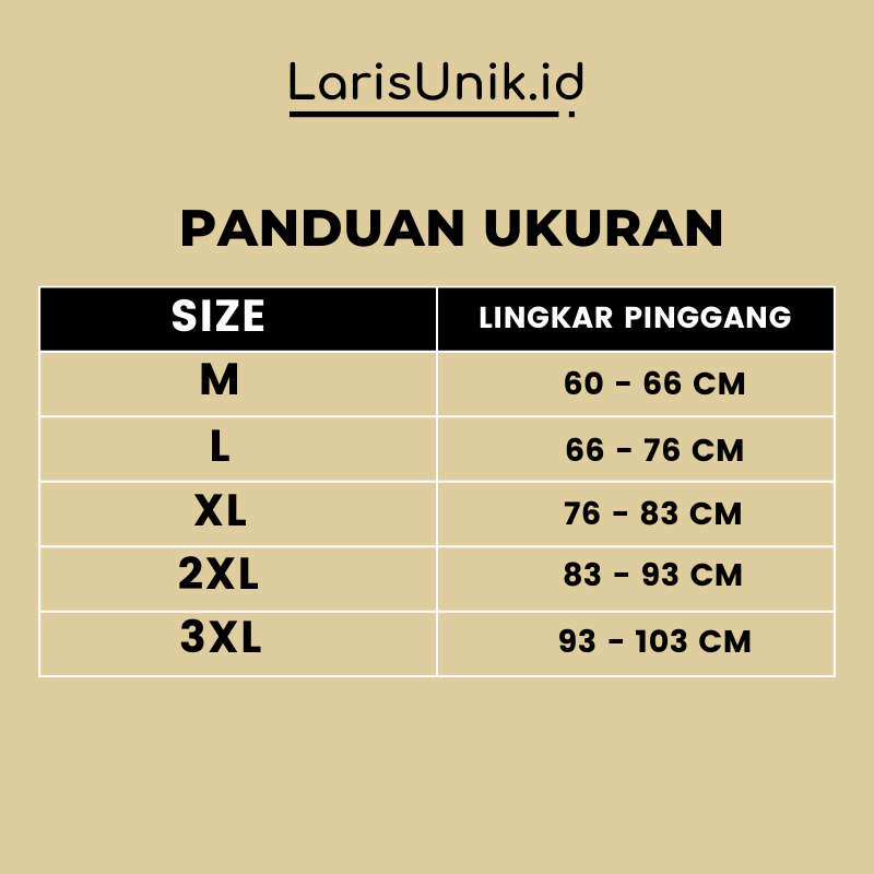 📌Panduan memilih ukuran berdasarkan lingkar pinggang dan berat badan M : Lp 60-66 cm, BB 55-60 kg L : Lp 66-76 cm, BB 60-65 kg XL : Lp 76-83 cm, BB 65-70 kg 2XL : Lp 83-93 cm, BB 70-75 kg 3XL : Lp 93-100 cm, BB 75-80 kg *ukuran diatas masih bisa melar 2-3 cm *gunakan ukuran lingkar pinggang karena bentuk tubuh tiap orang berbeda *berat badan hanya digunakan jika tidak tahu lingkar pinggang