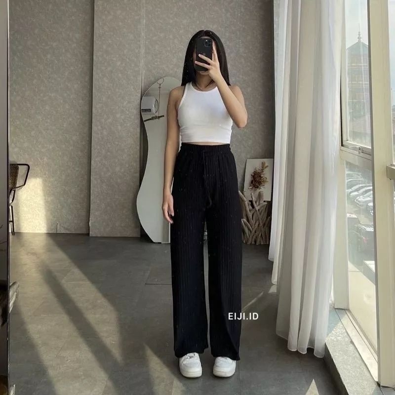 Celana kulot loose bahan cey pleats, model bahan bertekstur crinkle, flowy dan jatuh bikin looks santai tapi mewah untuk BB 45kg - Max 65 kg ya. Detail produk: (toleransi 1-3cm) Lingkar Pinggang : 60cm - 86cm Lingkar Paha : 66cm Lingkar Pinggul : 113cm Panjang : 93cm-96cm Pisak : 40cm
