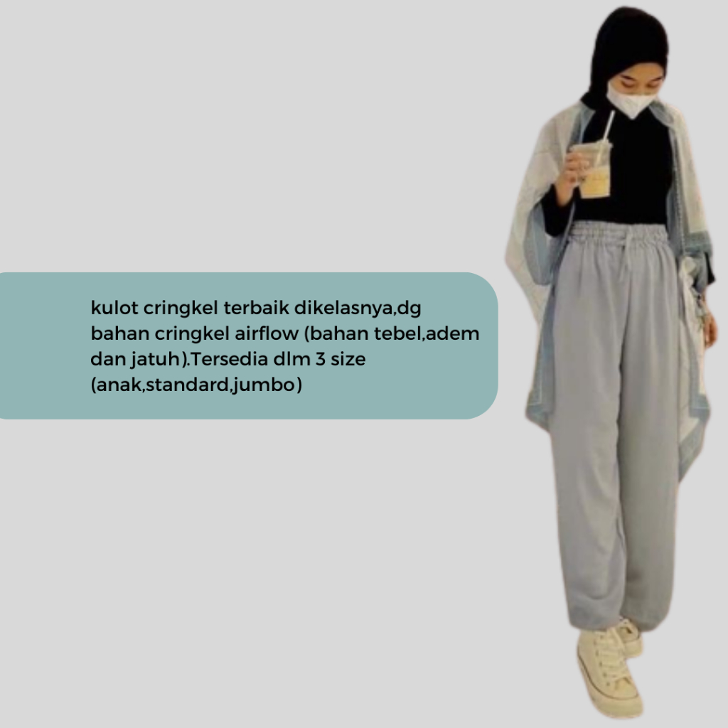 Material : crinkle airflow cotton premium SIZE ======================================= UKURAN JUMBO (BB 46-70KG) Panjang celana : 92cm (ANTI NGATUNG!) Lingkar Paha : 70cm ======================================= UKUTAN STANDARD (BB 30-45KG) Panjang celana 92cm Lingkar paha 60cm ======================================== UKURAN ANAK(BB 28-29) PJ CELANA 70 cm LINGKAR PAHA 55CM