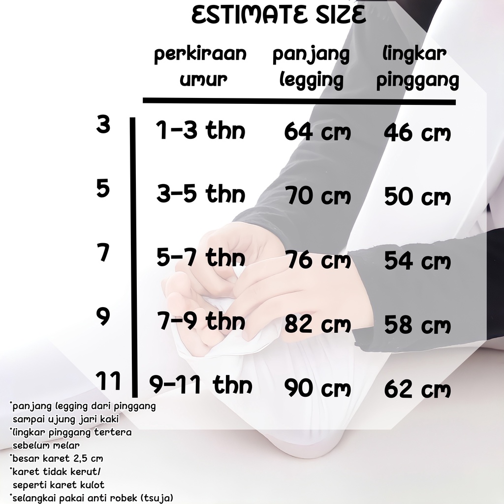 Perkiraan SIZE/UKURAN (-+) 3 = umur 1-3 tahun panjang legging 64 cm lingkar pinggang sebelum melar 46 cm 5 = umur 3-5 tahun panjang legging 70 cm lingkar pinggang sebelum melar 50 cm 7 = umur 5-7 tahun panjang legging 76 cm lingkar pinggang sebelum melar 54 cm 9 = umur 7-9 tahun panjang legging 82 cm lingkar pinggang sebelum melar 58 cm 11 = umur 9-11 tahun panjang legging 90 cm lingkar pinggang sebelum melar 62 cm