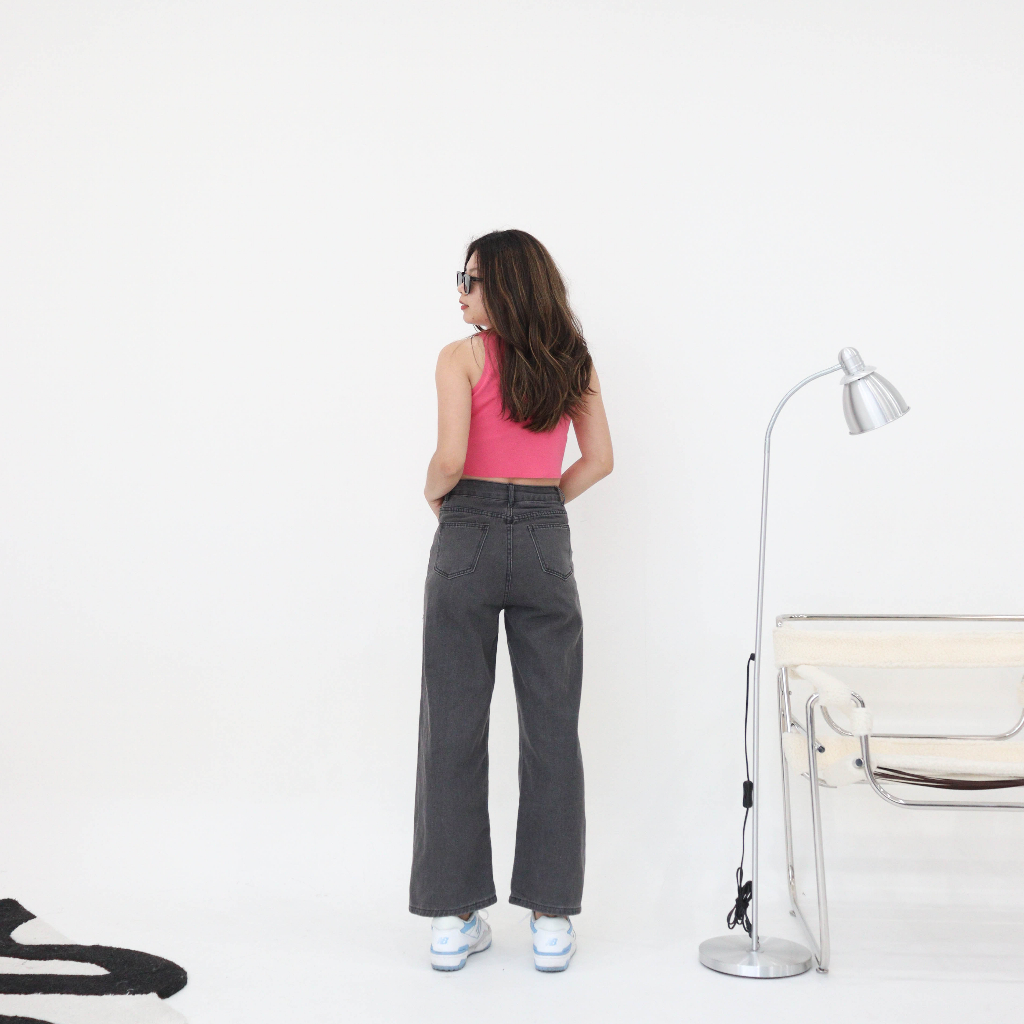 Detail x69 Celana Panjang Jeans Wanita High Waist Ripped Straight Jeans Plain Polos Snow Black Demorin