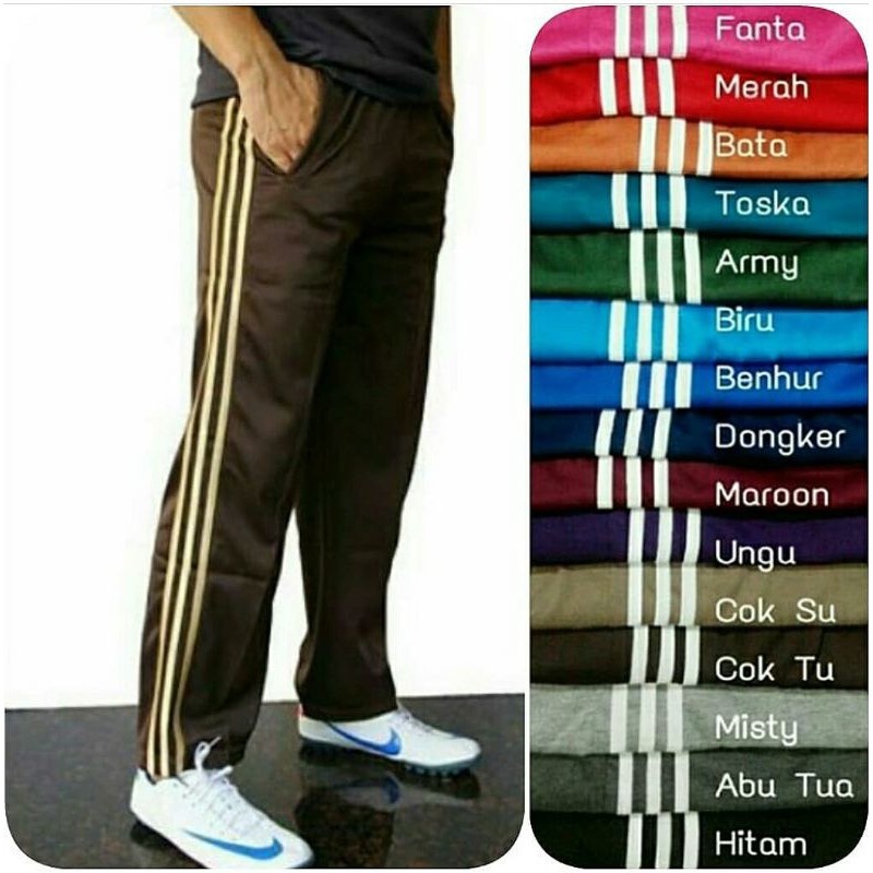 Celana training panjang / celana olahraga panjang bisa untuk pria dan wanita ukuran dewasa CELANA TRAINING / CELANA OLAHRAGA ini nyaman di pakai untuk olahraga maupun kegiatan sehari2 Spesifikasi : - ukuran Allsize - panjang kurang lebih 95cm - lingkar paha 63cm - lingkar pinggang sebelum melar 60cm - lingkar pinggang setelah melar mencapai 105cm - saku 1di samping kanan - terdapat tali kolor - Model Bawahnya Lurus Bukan Kerut Atau Kop 1kg muat 5 CELANA TRAINING OLAHRAGA Terimakasih dan silahkan di order