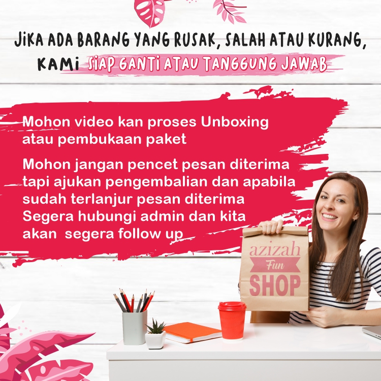 PERLU DIKETAUHI: * Kami juga menerima pesanan grosir atau partai besar. Untuk info lebih lanjut silahkan hubungi kami dan kami sarankan pengiriman lewat cargo (untuk menghemat ongkos kirim) * Sebelum order mohon untuk membaca terlebih dahulu deskripsinya atau bisa chatt kami. * Pastikan alamat pengiriman dan nomer yang dihubungi sudah benar, agar tidak terjadi kesalahan dalam pengiriman. * Order jam 00.00 sampai jam 15.00 kami kirim dihari yang sama (Kecuali tanggal merah, ada kendala atau suatu perubahan) * Dan setelah jam 15.00 kami kirim dihari berikutnya (Kecuali tanggal merah, ada kendala atau suatu perubahan) * Jadwal pengiriman ke paket kami jam 19.00 * Produk pesanan yang mau dikirim selalu kami cek untuk selalu memberikan yang terbaik untuk konsumen * Pengiriman atau jasa pick up ke ekspedisi sore sekitar jam 18.00 * Perubahan status pengiriman sekitar jam 21.00 * Jika ada pesanan yang kosong kita akan segera konfirmasi via chatt. Tapi jika tidak ada respon dari konsumen kita akan kirim barang yang model sama, ukuran sama dan motif yang hampir mirip dan tidak kalah bagus tentunya