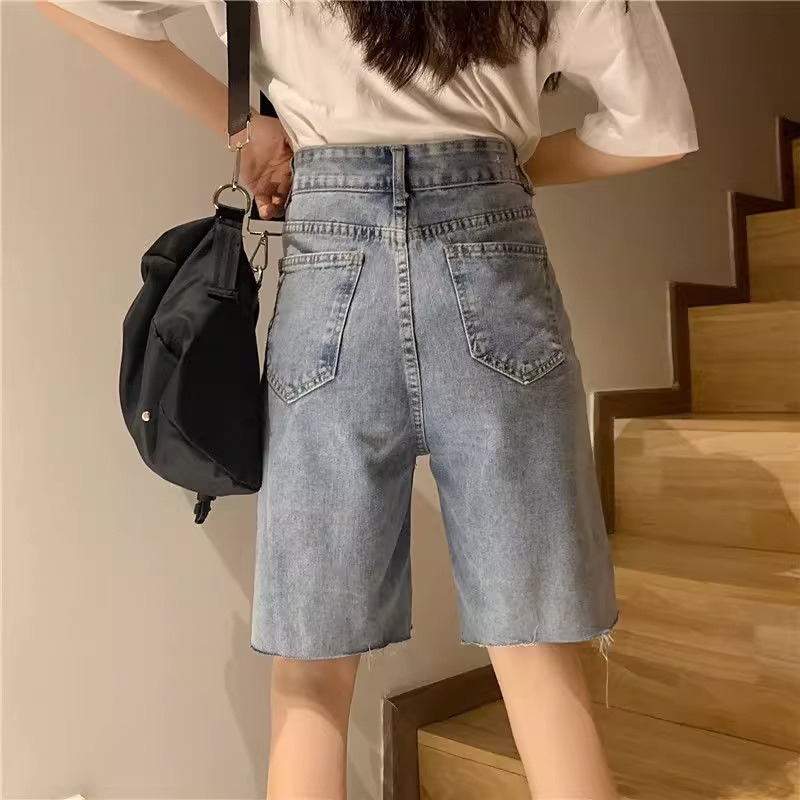 Detail Celana Pendek Jeans Wanita Robek Highwaist Biru