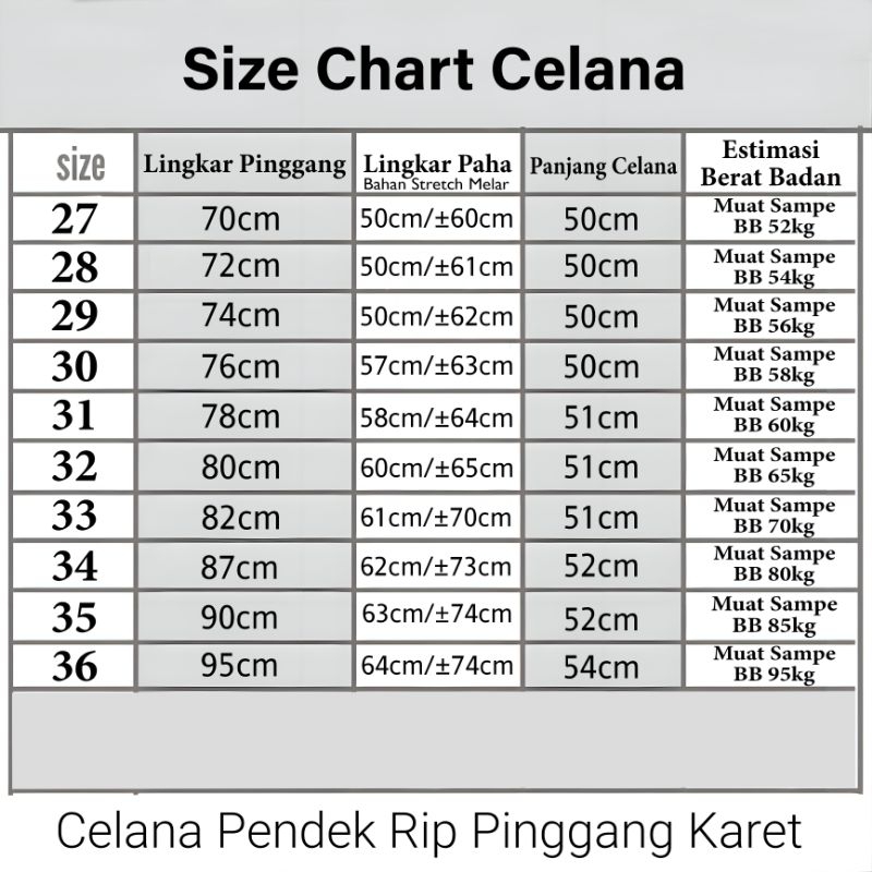 SIZE CHART : Size 28 = Lingkar Pinggang 70cm Lingkar Paha 50cm Panjang Celana 50cm Estimasi Muat Sampe BB 52kg