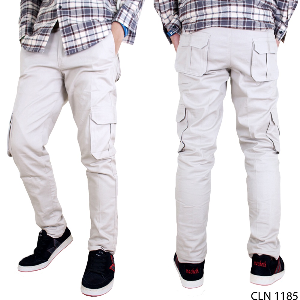 Warna : Abu tua dan lainnya Bahan : Stretch Ukuran : 28-32 Jenis : Cargo pendek dan panjang
