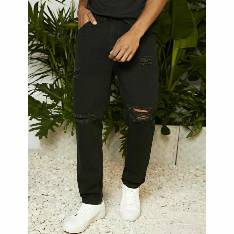 CELANA SOBEK PRIA RIPPED JEANS STANDAR BASIC REGULER ROBEK JINS HITAM 27-38