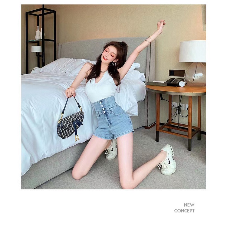 Detail Celana Super Tinggi Pinggang Celana Pendek Denim Wanita Elastis Slim Fit Pelangsing A-Line Hot Pants