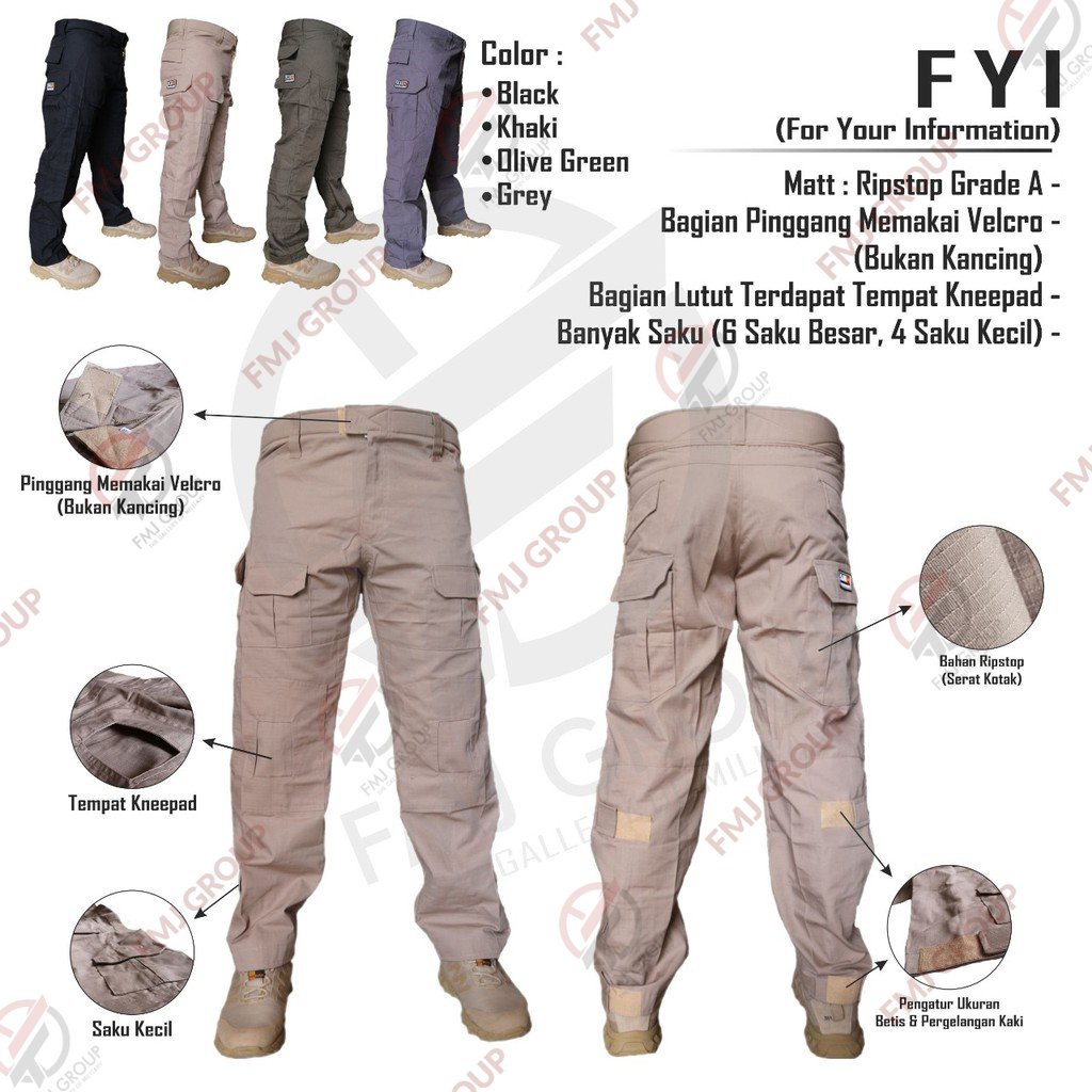 Bahan : Ripstop Grade A. Warna : - Abu - Hijau - Cream / Khaki - Hitam Ukuran : 28 . 30 . 32 . 34 . 36 . 38 . 40 . 42 .