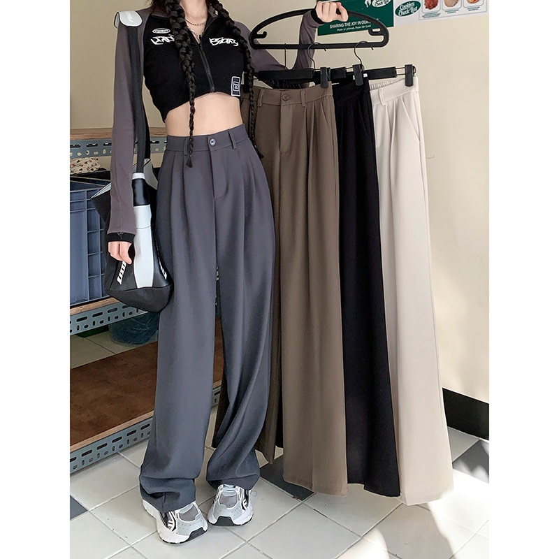 Pakaian Wanita > Celana Panjang & Legging > Celana Panjang & Legging Lainnya > ❧celana wanita import setelan abu-abu celana wanita musim panas 2023 baru longgar slim lurus celana pinggang tinggi drape lebar kaki mengepel celana celana wanita celana highwaist