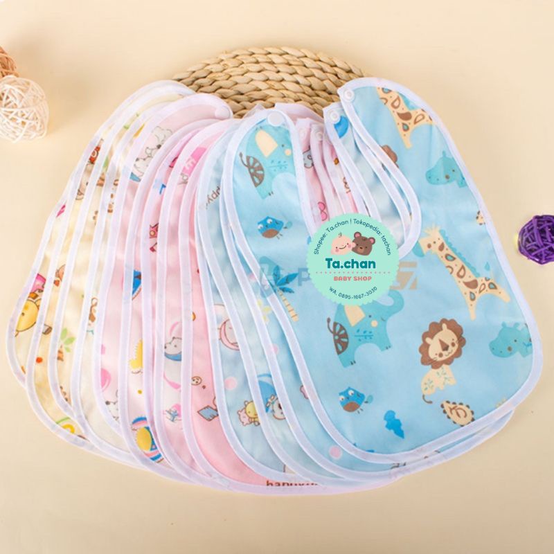 Celemek makan bayi waterproof / slabber baby / celemek bayi anti air anti tembus ke baju karena ada lapisan tahan air di bagian belakang, bagian depan kain lembut, dan ada kancing perekatnya.