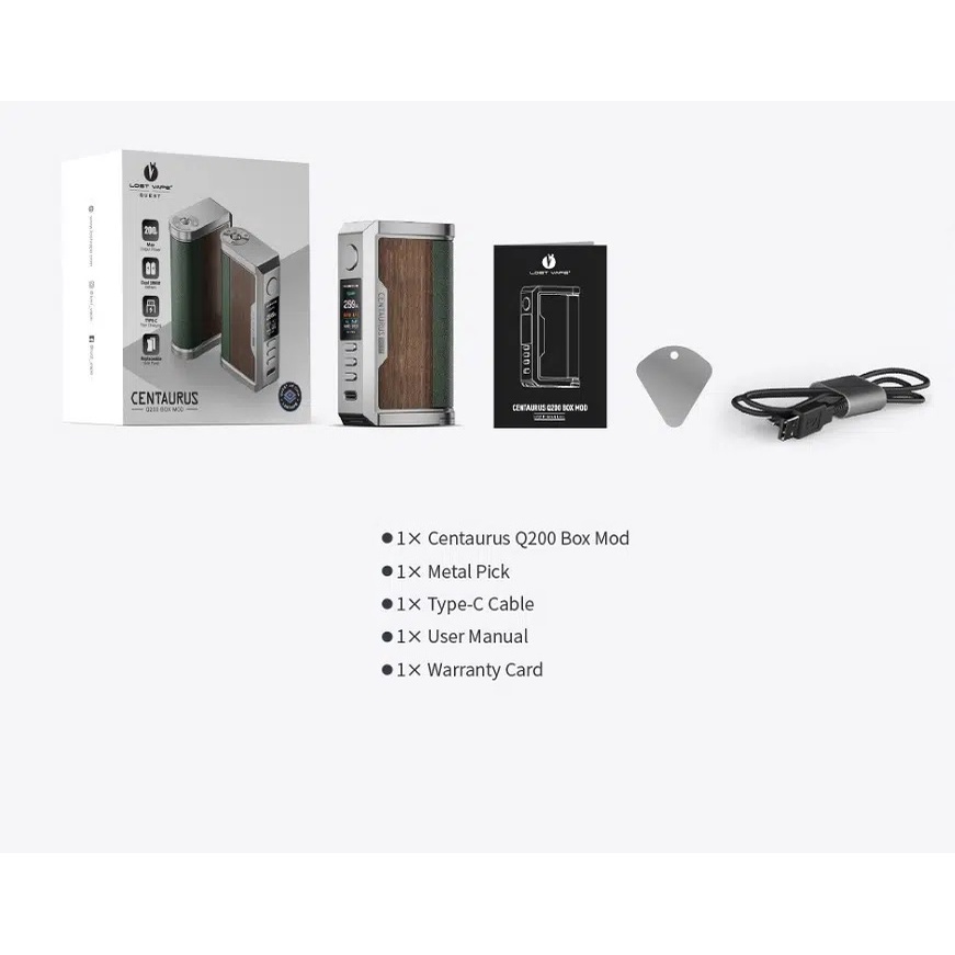 Lost Vape Centaurus Q200 Mod PACKAGE LIST 1 * Lost Vape Centaurus Q200 Box Mod 1 * Metal Pick 1 * Type-C Cable 1 * User Manual 1 * Warranty Card