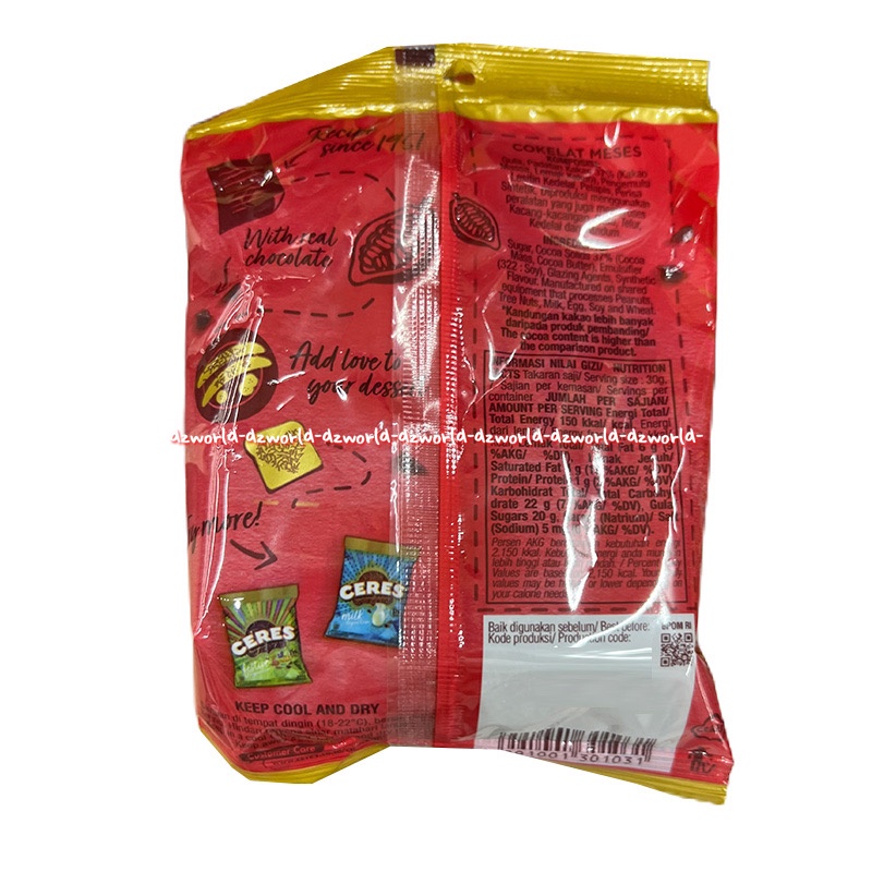 Merek : Ceres Jenis : Meses Ceres Ukuran : 80gram Tersedia dalam 3 pilihan rasa : - Dark Choco - Classic Merah - Festive Hijau - Milk Biru