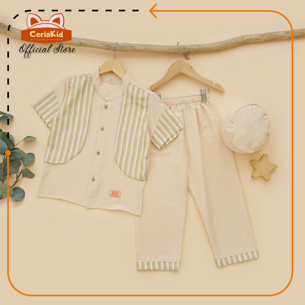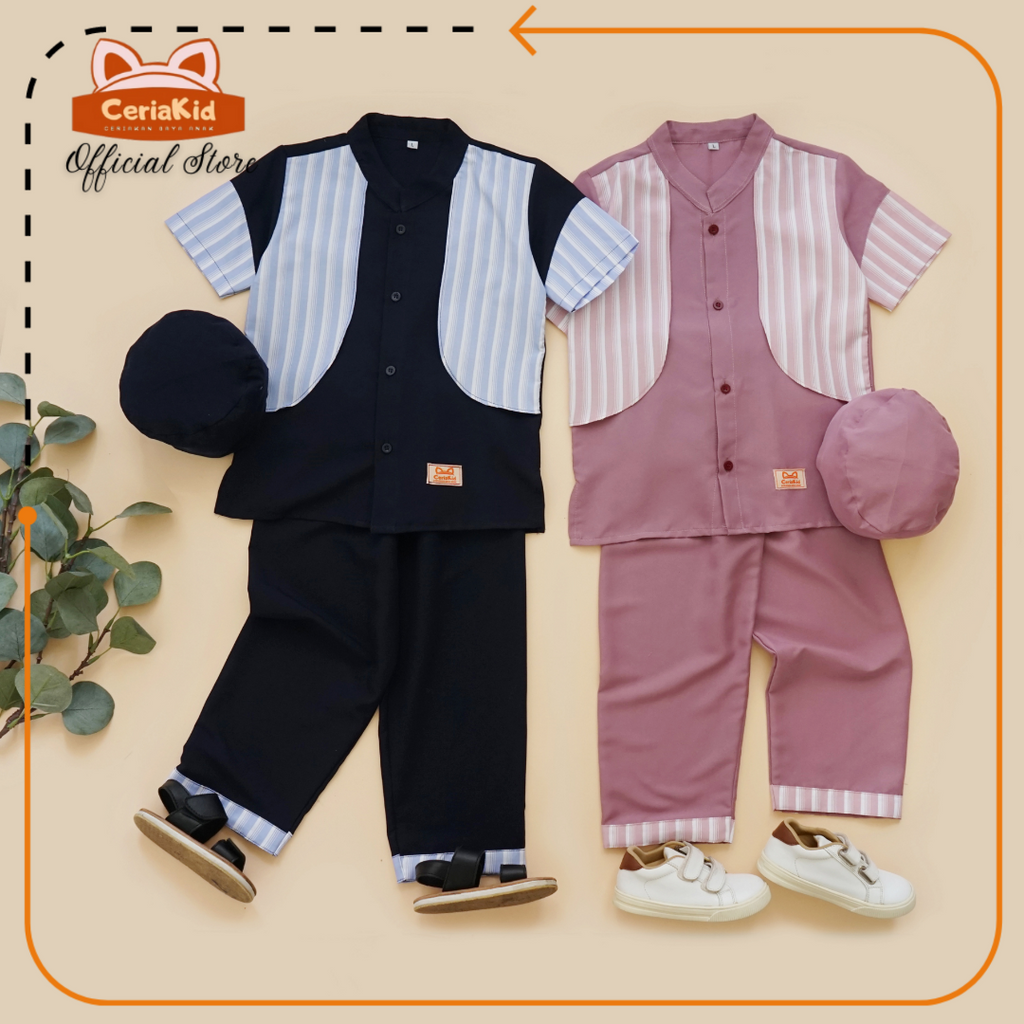 Seperti biasa koko anak one set Ceriakid terdiri dari baju, celana berbonus peci! Dan seperti koko-koko lainnya juga tersedia dari usia 0 sampai 9 tahun pastikan cek detailnya ya sebelum pesan karena beda anak beda besar