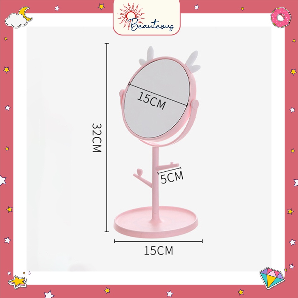 Cermin meja standing berbentuk bulat dan terdapat telinga kucing. Tersedia dua warna putih dan pink. Terdapat gantungan di badan kaca yang berfungsi untuk mengantungan acsesories maupun perhiasan. Terdapat tatakan yang bisa digunakan untuk menaruh kosmetik dll. Kaca bisa di putar.