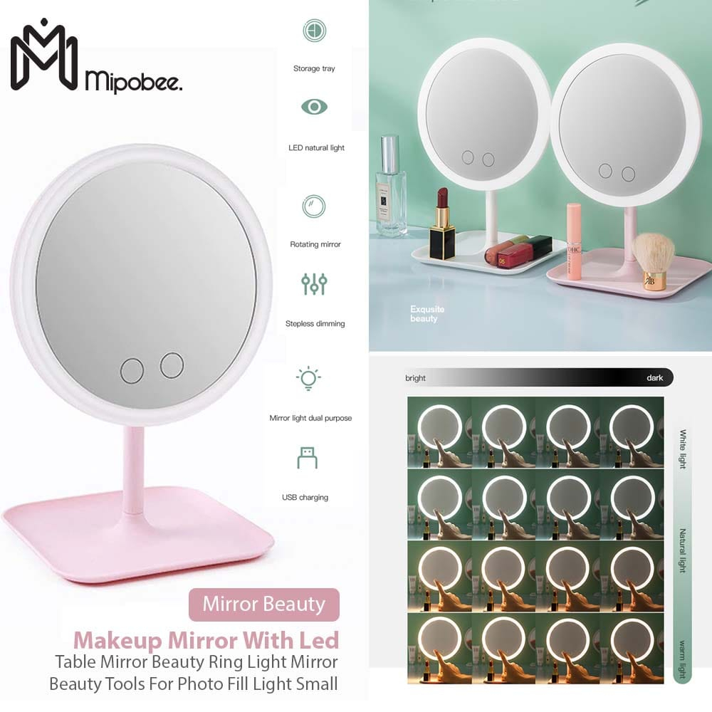 ⭐ CERMIN RIAS WAJAH WITH RINGLIGHT ⭐ Cermin ini berbeda dari cermin biasanya karena dilengkapi dengan lampu LED pada bagian depan sehingga Anda dapat dandan dengan lebih mudah dalam situasi kondisi apapun. ⭐Pada bagian stand cermin ini terdapat tempat kecil untuk menaruh make up dan barang-barang Anda sehingga tidak berantakan di meja. ⭐Switch On/Off menggunakan touch panel yang sangat sensitif, seperti menggunakan panel layar sentuh di smartphone.