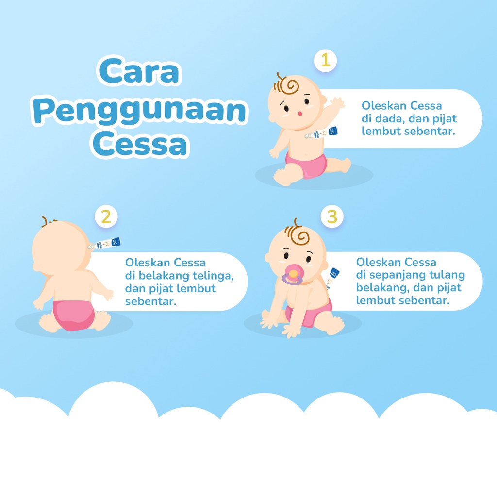 CARA PEMAKAIAN Cessa Immune Booster merupakan essential oil yang digunakan dengan cara mengoleskannya ke tubuh bayi. Berikut ini cara pemakaian yang dianjurkan untuk membantu meningkatkan sistem kekebalan tubuh pada bayi. - Oleskan dan Pijat Lembut Disepanjang Tulang Belakang bayi - Oleskan dan Pijat Lembut Pada Area Dada bayi - Oleskan dan Pijat Lembut Pada Area Belakang Leher bayi