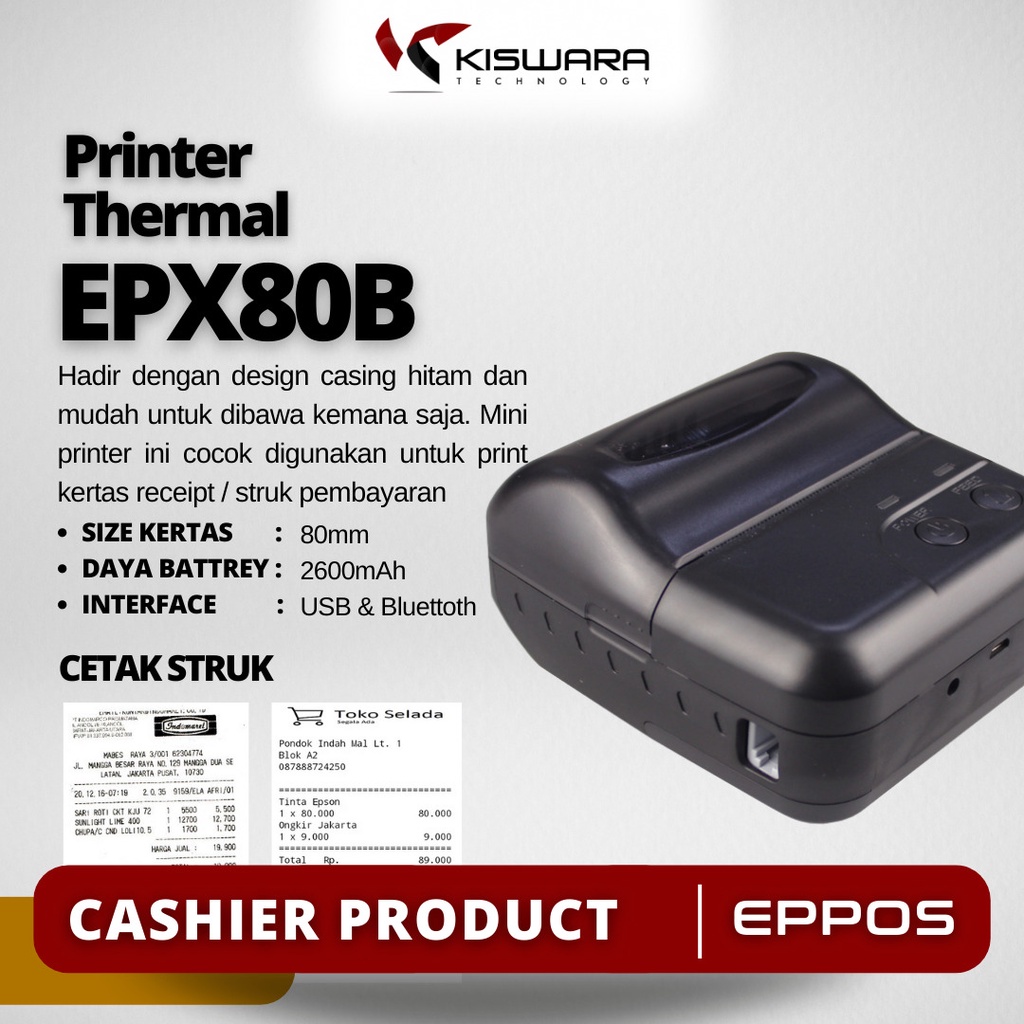 Mini Printer Bluetooth EPPOS EPX80B hadir dengan design casing hitam dan mudah untuk dibawa kemana saja. Mini printer ini cocok digunakan untuk print kertas receipt / struk pembayaran. Mini Printer Bluetooth EPPOS EPX80B Thermal Printer bekerja dengan cara thermal, bagian kertas yang akan ditulis akan dipanaskan sehingga membentuk tulisan hitam. Cocok dan sangat praktis digunakan untuk print kertas receipt / struk pembayaran dan dapat digunakan juga untuk mencetak secara langsung dari smartphone Anda