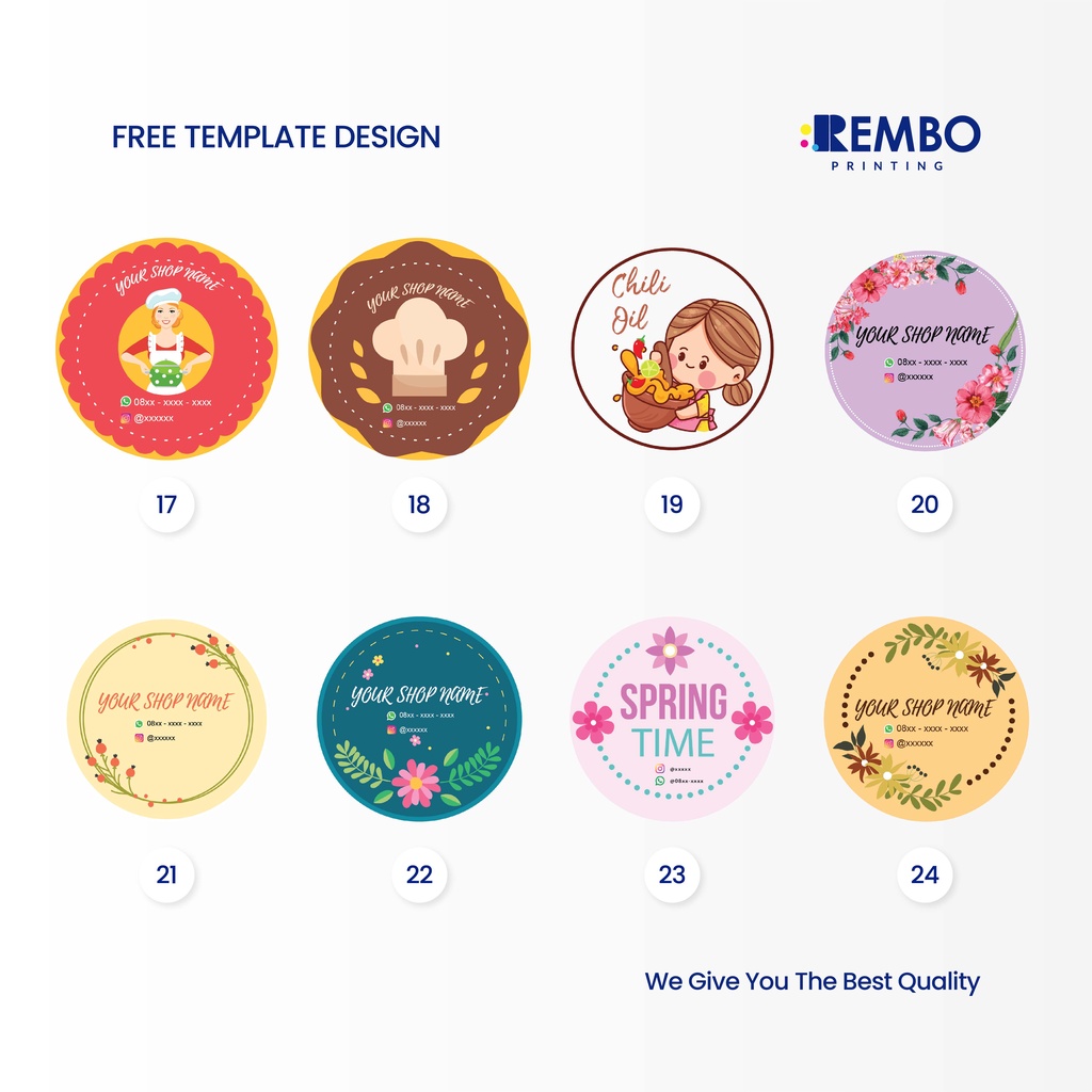 Spesifikasi : * Bahan Chromo * Dicetak Bulat * Cutting kisscut * Sticker label sudah dipotong bentuk menggunakan mesin cutting khusus * Jenis Printer : Ricoh C9200 Graphic Arts Edition * Produk terdapat minimal order dan berlaku kelipatan