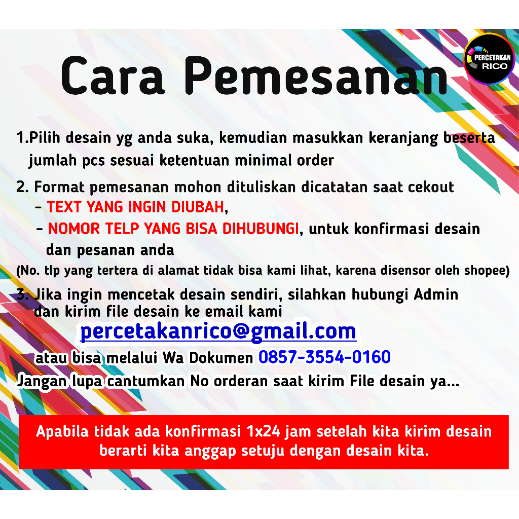 CARA PEMESANAN : 1. Pilih varian design yang kamu suka dan masukkan jumlah pesanan yang kamu inginkan (sesuai minimal order, silakan dilihat difoto produk slide kedua) 2. Format pemesanan mohon dituliskan dicatatan saat checkout β’ π TEXT YANG INGIN DIRUBAH, β’ π NOMOR TELP YANG BISA DIHUBUNGI, untuk konfirmasi desain (No. yg tertera dialamat tidak bisa kami lihat, karena disensor oleh shopee) 3. Jika kakak punya design sendiri, silakan chat Admin ya, lalu kirimkan file siap cetak (resolusi tinggi) dengan format Jpg/Png 3. Untuk info lebih lanjut silahkan LANGSUNG CHAT ADMIN π
