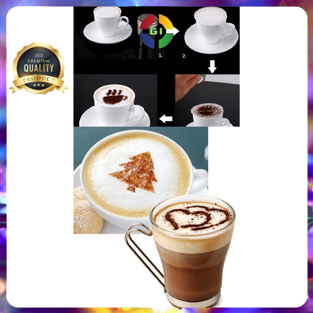 Fitur Untuk Latte Art Cara menyiapkan kopi dengan menciptakan pola atau desain di permukaan latte. Selain itu Anda dapat menggambar atau melukis di lapisan atas busa. Dengan menggunakan cetakan ini, Anda dapat melakukan penggambaran di atas permukaan kopi dengan mudah dan cepat.