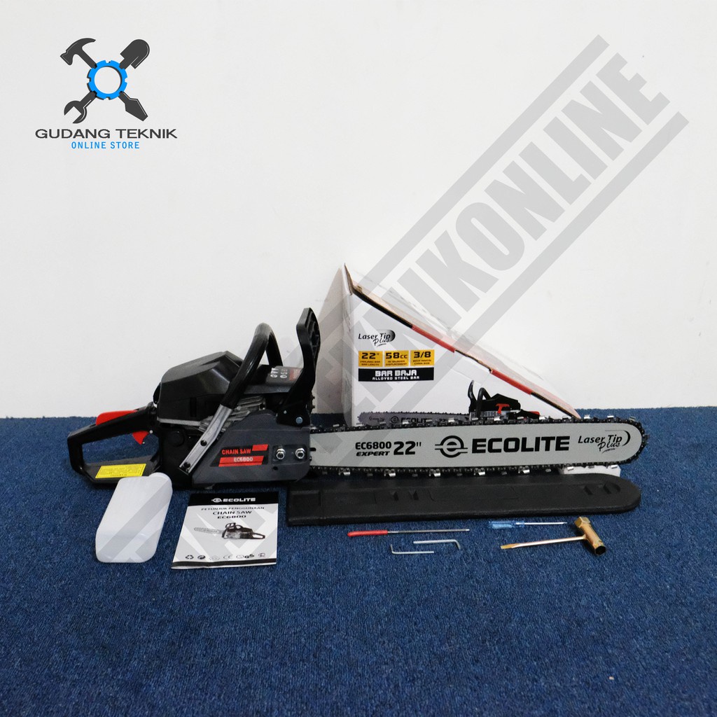 Merk : ECOLITE Engine : Air Cooled , 2 Stroke , 1 Cylinder Displacement : 58 cc Power : 2.4 KW Idle Speed : 2800 - 3000 rpm High speed : 11500 rpm Ratio Campuran Bensin / Oli 2T : 25 : 1 Kapasitas Tangki Minyak Campur : 550 ml Kapasitas Tangki Oli Rantai : 260 ml Ukuran Bar : 22 inch
