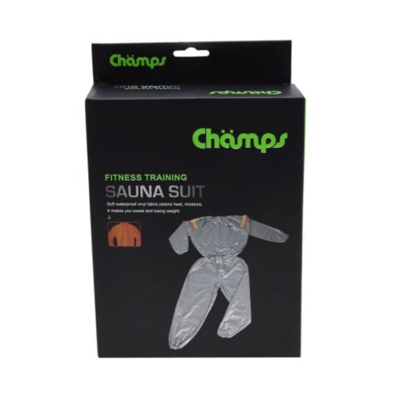 Untuk Anda yang tidak memiliki banyak waktu untuk membakar kalori karena kesibukan harian kini tidak perlu khawatir. Pakaian sauna Champs mampu membakar kalori dalam tubuh Anda cukup dengan memakainya secara teratur. Pakaian ini terbuat dari bahan vinyl dan fabric, dapat menyimpan panas dan kelembapan sehingga hanya dengan memakainya tubuh Anda akan memproduksi keringat yang pada akhirnya dapat menurunkan berat badan Anda. Gunakan secara teratur untuk hasil maksimal.