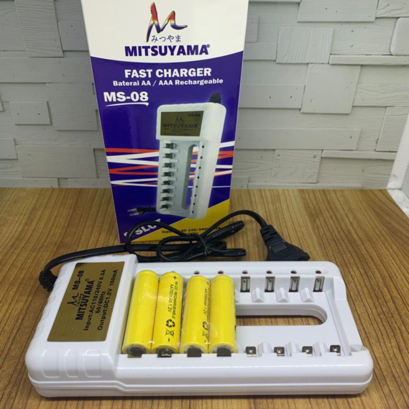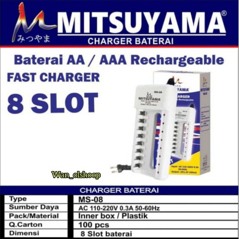 Alat Cas Baterai AA AAA 1.2V Mitsuyama MS-08 8Slot Charger MS-08 merupakan charger dengan 8 slot baterai yang dapat mencharger baterai AA, AAA NiCD NiMh dengan cepat, dapat memperbaiki sel baterai rusak dan mencharger ulang baterai alkaline.