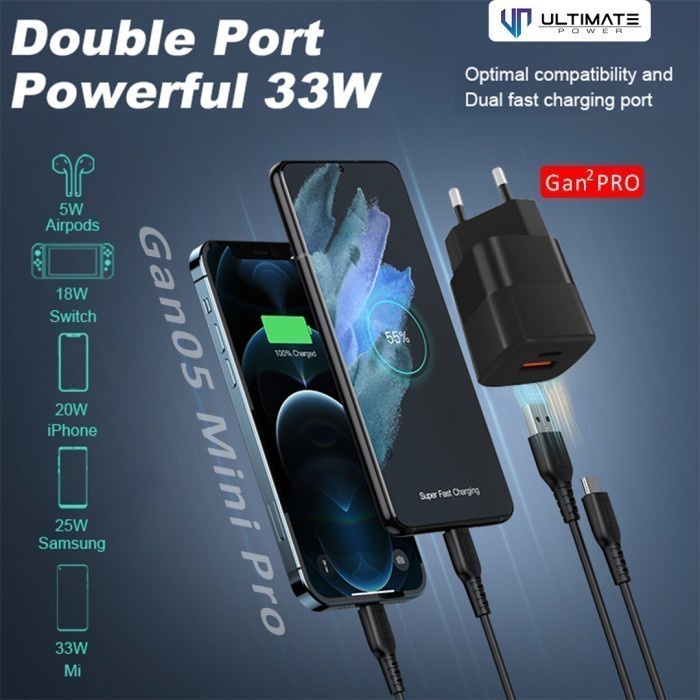 Ultimate Gan 33W Super Mini Fast Charger Gan05 Mini PRO adalah charger Gan 33w dengan ukuran TERKECIL jika dibandingkan dengan charger 33w biasa. Ukuran kecil tetapi kuat ini bisa tercapai karena charger ini menggunakan material Gallium Nitride.