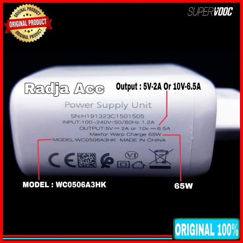 Spesifikasi: - Model : WC0506A3HK - Maxfor Warp Charge 65 Watt - Kabel Data USB C - Input : 200-240V~50/60Hz , 1,2A - Output Besar : 5V - 2A or 10V - 6.5A ( SUPER VOOC / SUPER DART 65 WATT ) - SN : H191323C1501505 - SUPER VOOC 65 WATT / SUPER DART 65W ( Pengisian Super Cepat ) - Pack : Original DUSBOX - Garansi 30 hari