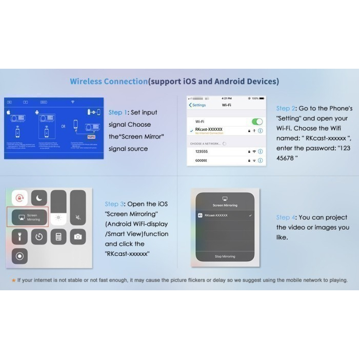 Untuk koneksi dengan smartphone, cukup gunakan WiFi agar apa yang tampak pada layar gadget bisa terproyeksikan melalui proyektor.