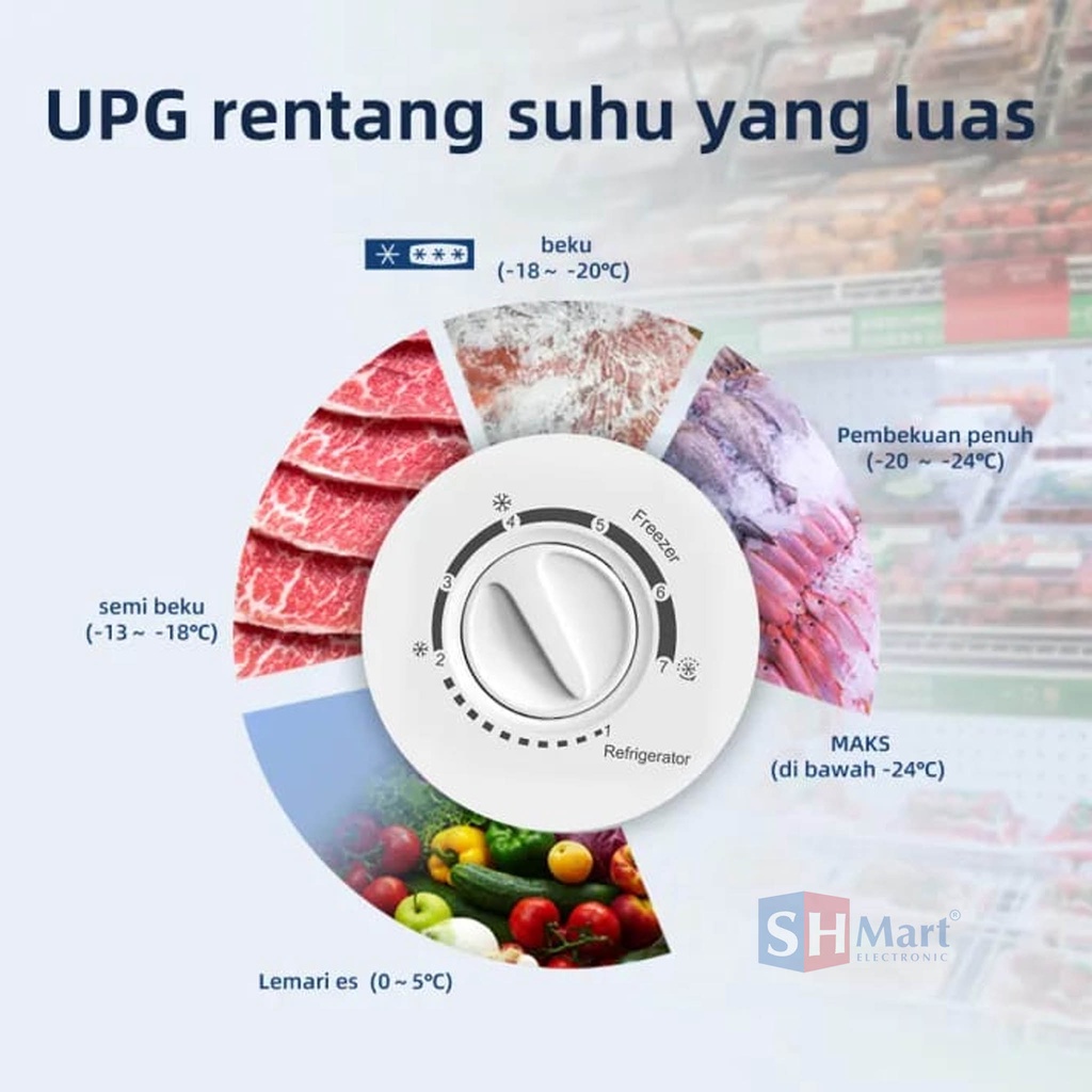 Spesifikasi : Kapasitas : 260 Liter Suhu : -5 C s/d -20 C Ukuran (P x L x T) : 98 x 56 x 85 cm Daya (W) : 87 WATT Tegangan : 220V / 1P Berat (Kg) : 55 Kg Kapasitas Simpan : 180 Kg Kapasitas Beku : 24 Kg / 24 jam Pendingin : R600