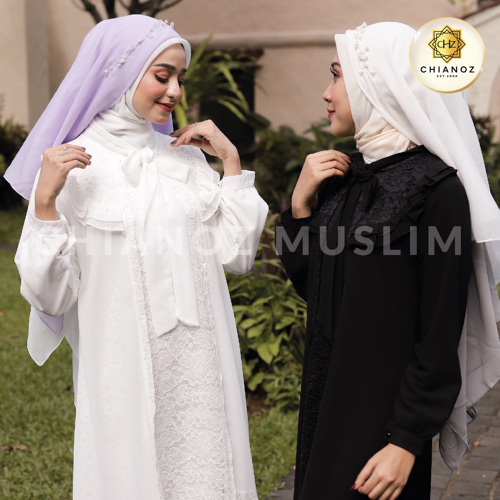 Detail CHIANOZ Gamis Putih Mewah Nadia Dress Brukat Renda Baju Lebaran Umroh Haji Manasik Pesta Akad 337 335