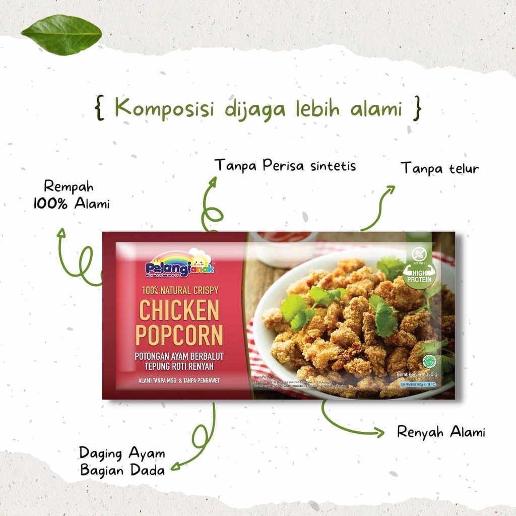 PELANGI Chicken Popcorn adalah potongan dada ayam premium. Rasanya gurih alami yang berpadu dengan baluran tepung renyah.