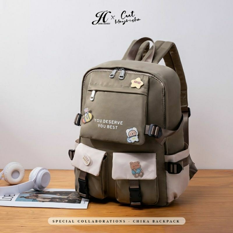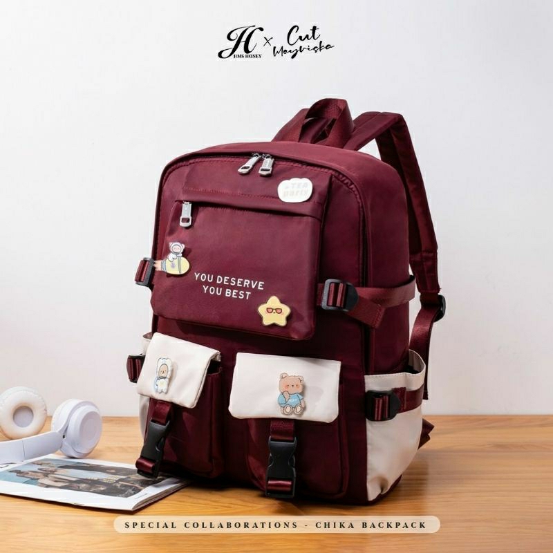 Chika Backpack from Jims Honey yang berkolaborasi dengan @cutratumeyriska Dengan bahan parasut yang sangat ringan dan nyaman serta tahan air sehingga bisa melindungi benda-benda di dalam tas dari kerusakan akibat air