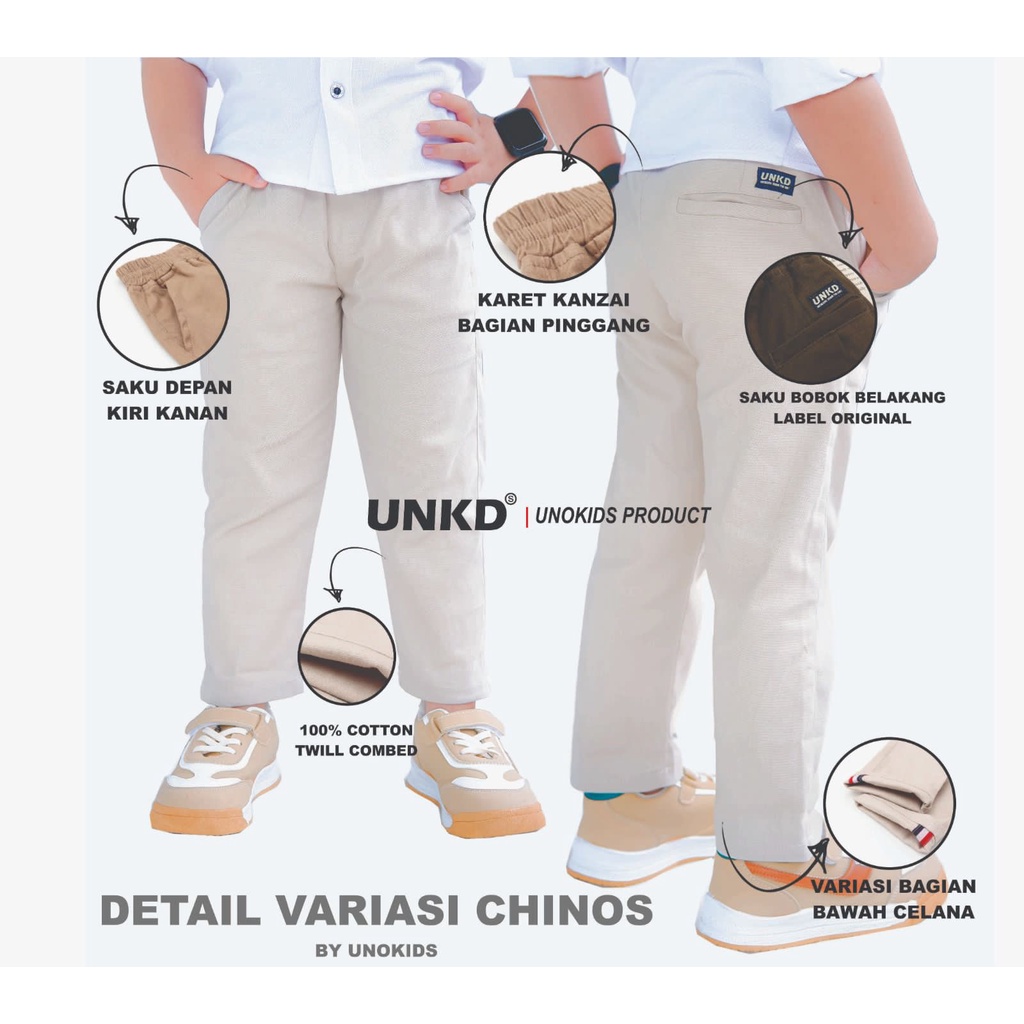 UNKD CHINOS TWILL AUTHENTIC terbuat dari bahan 100% Cotton Twill Combed yang sudah teruji dengan tekstur yang lembut dan berkarakter Stretch (meral) sehingga nyamanan saat dipakai. pinggang menggunakan karet elastis diJahit dengan Kanzai Elegant sehingga nyaman digunakan anak-anak, dua saku depan berfungsi dan saku bobok dibagian belakang juga berfungi sehingga menjadi lebih elegant. Variasi peterban ๐ซ๐ท bagian bawah menambah karakter mewah jika dilipat.๐