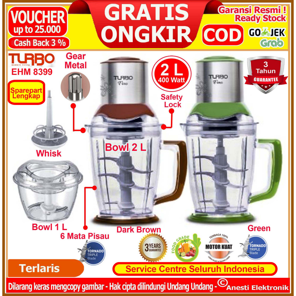 Chopper Turbo EHM 8399 merupakan pelumat yang dilengkapi dengan motor, dan sangat mudah untuk digunakan. Mampu melumatkan segala jenis daging dan sayuran.