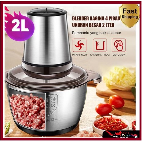 Fungsi : 1. Blender daging Stainless menggunakan mata pisau yang tajam memudahkan kita mengelolah makanan/daging lebih halus. 2. Dengan tenaga yang kuat dan besar dengan kekuatan ganda, menggiling dengan cepat 3. Menggiling/mencacah daging sayuran dan berbagai pelengkap masakan dalam hitungan menit 4. Kapasitas wadah 2L, sekali giling 0.5 - 1 kg 5. 2 mode giling, mode lambat untuk menggiling bahan masakan yang lebih lembut, dan mode cepat untuk menggiling bahan masakan yang lebih keras. 6. Aman digunakan, mesin panas akan berhenti otomatis 7. 4 mata pisau, memotong dengan sangat cepat