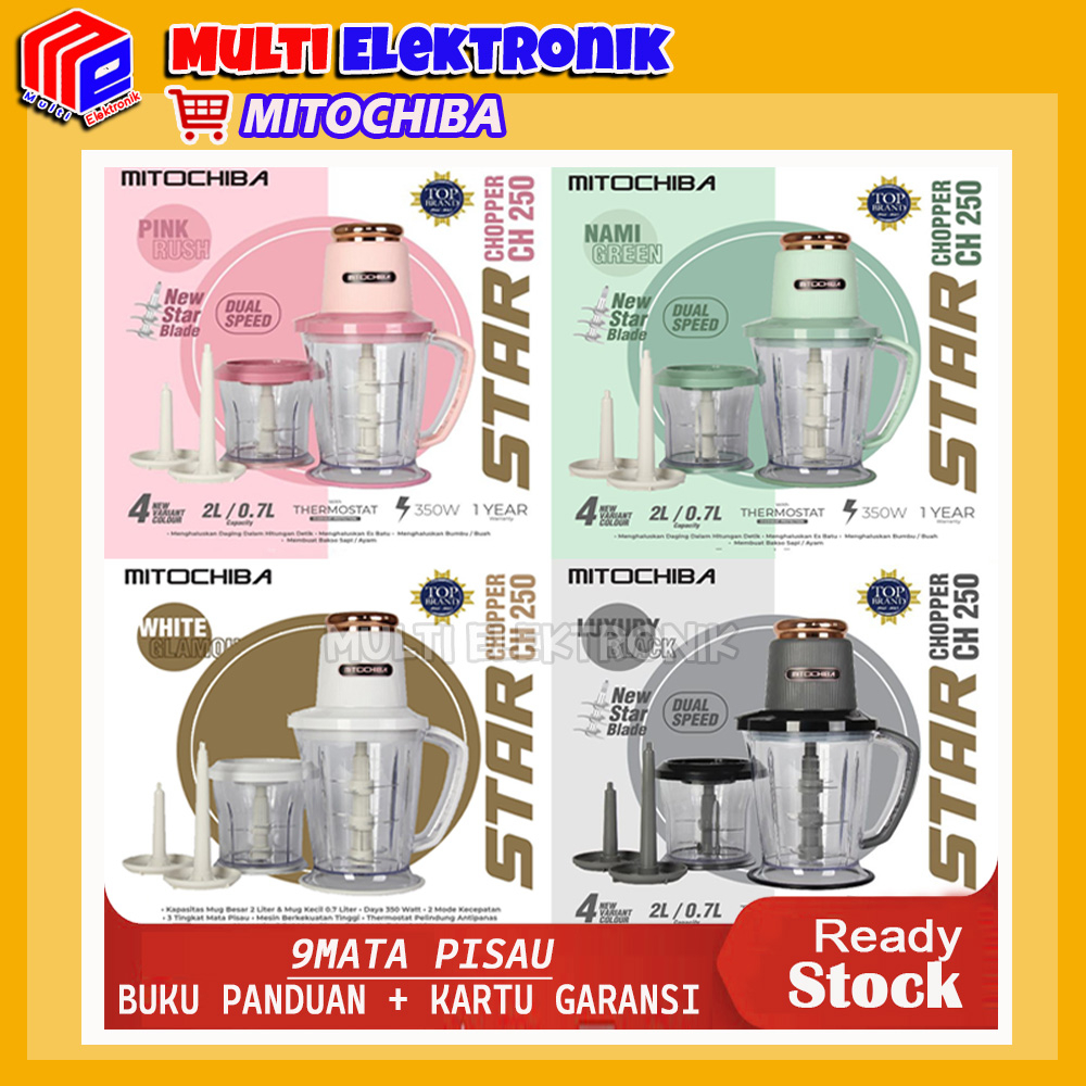 Star Chopper CH-250 2 Liter dan 700 ml, mampu menggiling daging hingga halus, bumbu--bumbu dapur, membuat aneka bakso hingga MPASI Anak, sangat cocok untuk segala keperluan dapur. . Kegunaan Chopper Mitochiba: *menggiling bumbu2 dapur *menggiling halus daging sapi/ayam/ikan *menghaluskan es batu *mpasi anak *mengocok telur putih *membuat juice *membuat Bakso *Selai kacang, strawberry dll