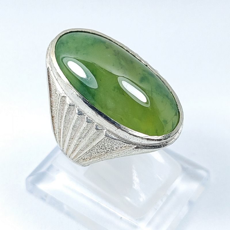 BISMILLAH ID : NATURAL IDOCRASE Market Name : LUMUT SUNGAI DAREH PUCUK PISANG KODE 02654 Origin : Sumatera Barat (IND) Diameter Stone :26*13*7 mm (Est) Size Ring: 7,5 Type Ring : Alpaca Super Skala Kekerasan (Mohs) : 6-6,5 Cut : Chabocon Shape: Oval