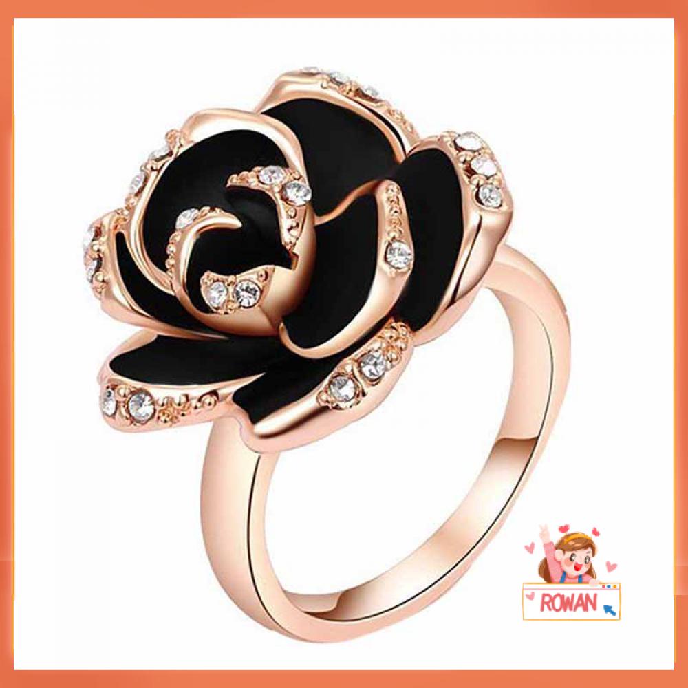 Detail Cincin Desain Bunga Mawar Kristal Warna Hitam Emas Dapat Disesuaikan Untuk Wanita